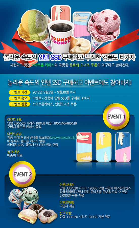 이번 인텔 SSD 이벤트는 9월 30일까지 진행되며 120GB 시리즈 구매자 전원에게 베스킨라빈스 쿠폰을 제공하며 180GB 시리즈 이상 구매자에게는 인텔 SSD 사이트(http://www.realssd.co.kr)에 신청하면 핸드폰 케이스를 증정한다.