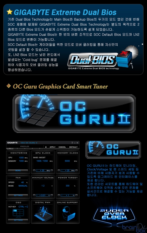GIGABYTE GeForce® GTX680 SOC는 그 외에도 ‘Dual Bios’ 기능을 통해 한 번의 버튼 조작으로 ‘SOC Default Bios’ 모드와 ‘LN2 Bios’ 모드로의 변환이 손쉽게 가능하다. ‘SOC Default Bios’는 게이머들을 위한 모드로 오버 클러킹을 통해 자신만의 셋팅을 설정 할 수 있으며, ‘LN2 Bios’ 모드는 낮은 온도에서 발생되는 ‘Cold burg’ 문제를 해결하여 사용자의 오버 클러킹 성능을 향상 하였다. 게다가 OC Guru2 소프트웨어를 지원 하여 하드웨어 모니터링, Clock/Voltage 및 팬 스피드 세팅 등 기존에 비해 사용자가 쉽게 사용할 수 있도록 업그레이드 된 인터페이스를 제공 하며 온라인 서포트를 통해 하드웨어 및 소프트웨어 오작동 시의 모든 문제를 실시간으로 해결할 수 있는 기능을 제공한다.