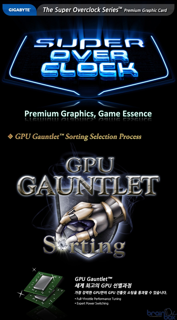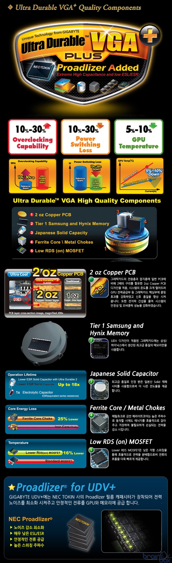 이 제품의 또 다른 특징은 GIGABYTE社의 SOC 모델에만 적용된 최고 품질의 GPU선별 과정(이하:GPU Gauntlet)을 통해 GPU를 선정, 2oz Ultra Durable VGA+(이하:UDV+) 설계기술로 디자인 되어 일반 PCB에 비해 2배의 구리 Layer를 함유, 시스템의 안정성을 최우선으로 고려하고 있다. 또한 최고 품질로 인정 받은 일본산 Solid 캐패시터 및 Low RDS MOSFET 을 사용함으로써 더 나은 전기적 특성을 가지고 있으며 NEC TOKIN社의 Proadlizer 필름 캐패시터가 장착되어 노이즈를 최소화 시켜주고 효율적인 전력 분배를 통해 안정적인 전류를 GPU와 메모리에 공급한다.