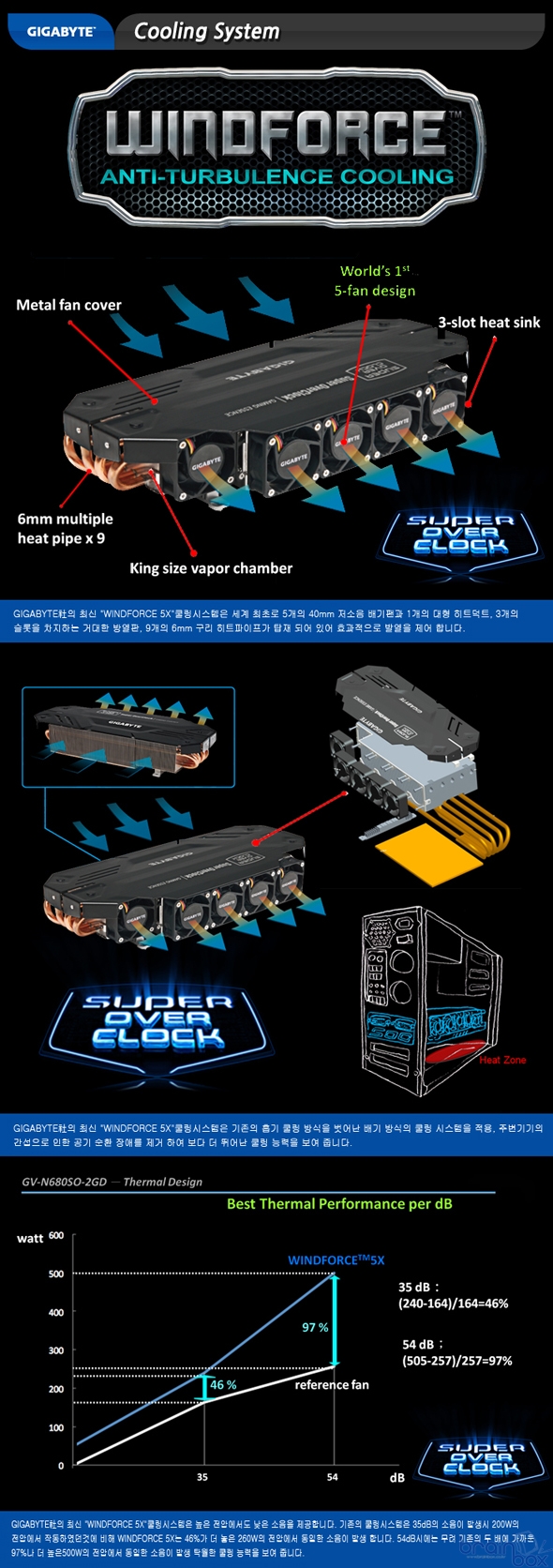 GIGABYTE GeForce® GTX680 SOC 제품은 이미 알려진 바와 같이 GIGABYTE社의 최신 기술이 집약된 그래픽 카드 이다. 이번 GTX 680 SOC에는 UDV+, 8Phase GPU digital power design, GPU Gauntlet, Dual Bios 외에도 새롭게 선보이는 Windforce 5X 쿨링 시스템 및 OC GURU2 소프트 웨어가 탑재된 게이밍 및 오버클러킹에 최적화 된 그래픽 카드로 게이머들과 오버 클러커들의 많은 관심을 받을 것으로 예상된다. GIGABYTE GeForce® GTX680 SOC 제품에 처음으로 선보인 "WINDFORCE5X Cooling system"은 이미 그 성능과 내구성으로 인정받은 WINDFORCE Series의 최신 쿨링 솔루션으로서 40mm의 5개 저소음 fan이 기존의 흡기 방식이 아닌 배기 방식으로 동작한다. 3슬롯을 차지하는 거대한 방열판과 9개의 6mm 구리 히트 파이프를 통해 공기의 흐름을 제어 함으로써 발열을 억제하고 뛰어난 쿨링 성능을 보여준다. 또한 기존 쿨링 시스템과 비교하여 최대 97% 높은 전압(500W)에서도 WINDFORCE Series의 특징인 낮은 소음을 제공한다.