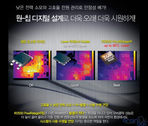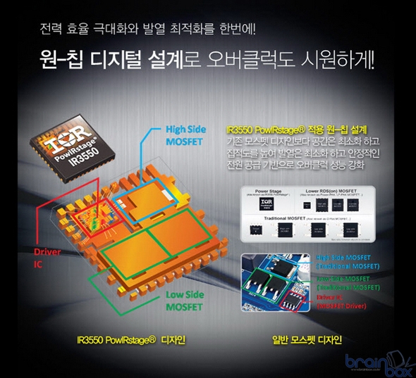 GA-Z77X-UP4 TH 썬더볼트 메인보드에 적용된 Ultra Durable5 설계는 기존 Ultra Durable4 기술에 새로운 원-칩 디지털 컨트롤 전원 설계를 추가하여 모스펫 구조는 간소화 시키고, 전원 효율을 최대 95%까지 끌어 올린 것이 특징이다. Ultra Durable5 원-칩 디지털 설계는 기존 복잡한 모스펫 구조와 다르게 한개의 칩안에 High Side MOSFET, Low Side MOSFET, MOSFET 드라이버를 IC칩으로 구현하여 PCB에서 전원부가 차지하는 면적을 대폭 감소시키고 공간을 확보하여 전력 손실률과 발열량을 최소화하여, 장시간 과-부하가 발생시에도 일반 시스템보다 낮은 발열과 높은 안정성으로 시스템 수명을 극대화한다.