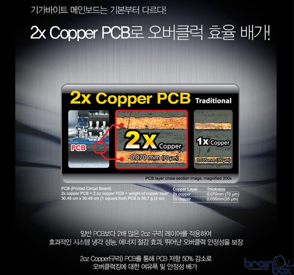 추가적으로, "유리섬유 기반의 2x Copper(구리) PCB"를 적용하여 PCB의 내부/외부 표면 밀집도를 높혀 습기에 강하게 설계 되었으며, 일반 PCB 보다 2배 많은 Copper(구리) Layer가 적용되어 냉각 효율은 극대화하고, 최대 2배 낮은 임피던스를 기반으로 오버클럭 성능 극대화는 물론 일반적인 사용환경에서 발생하는 각종 문제와 불량을 최소화 하였다.