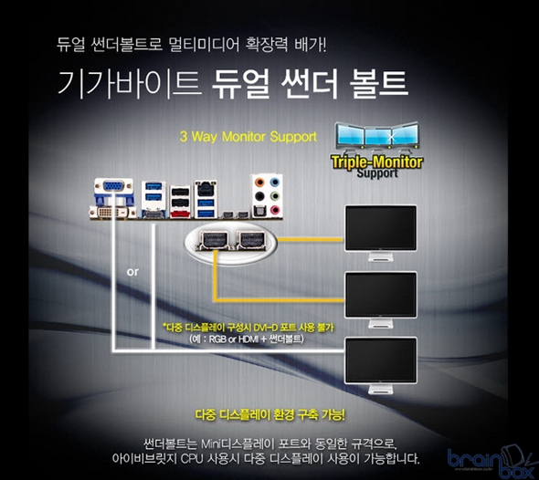 또한, 듀얼 썬더볼트 포트는 Mini-디스플레이 포트와 동일한 규격을 가지고 있어 별도의 외장 그래픽 없이 아이비브릿지 CPU에 내장된 GPU만을 통해 트리플-모니터 사용이 가능하여 멀티 태스킹 환경 구축 및 홈 엔터테인먼트 시스템을 구축하는데 용이함을 제공한다.
