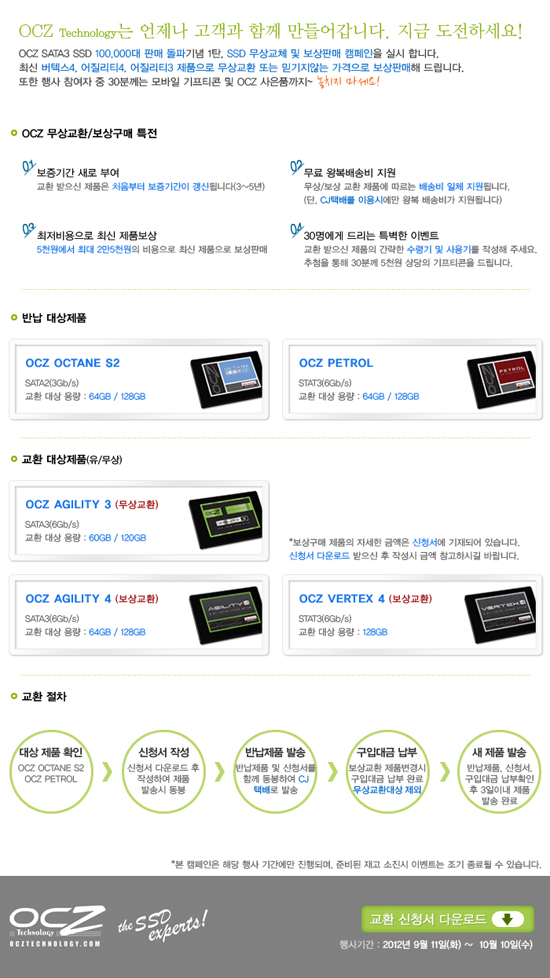 행사는 9월 11일부터 오는 10월 10일까지 한달 간 진행될 예정이며, OCZ 베스트셀러 SSD인 어질리티3와 최신 에베레스트2 플랫폼을 탑재한 버텍스4, 어질리티4 제품으로 무상교체 및 보상판매를 실시한다. 특히 준비된 물량 소진 시까지만 진행되기 때문에 선착 순 진행 후 조기 종료될 가능성도 높을 것으로 전망된다.