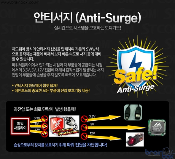 메인보드의 주요한 고장원인이 되는 서지(Surge)를 보다 효과적으로 차단하기 위한 하드웨어 방식의 안티서지회로를 탑재한 것도 핵심적인 시스템 보호 솔루션이다. 하드웨어방식의 안티서지 회로는 소프트웨어 방식의 기존 방식보다 서지 대응속도가 보다 빠르게 동작하여 서지 보호 기능을 대폭 향상시켰다고 할 수 있다. |