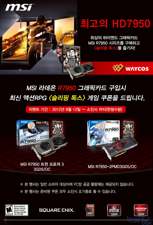 -MSI R7950 시리즈 구매 고객 이벤트 세계 최고의 VGA 제조 기술력을 갖춘, MSI의 한국 공식 디스트리뷰터인 ㈜웨이코스(대표:고민종)가 MSI 고성능 라데온 7950 시리즈 그래픽카드 구입 시, 최신 ‘슬리핑 독스’ 게임 다운로드 쿠폰을 증정하는 행사를 실시한다.