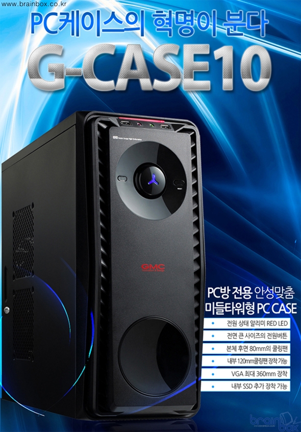PC방 환경에서의 사용에 최적화된 GMC G-CASE 10은 편의성과 내구성 증대에 초점을 맞추고 개발됐다. 외부에서 작동 상황을 쉽게 파악할 수 있는 상태 LED를 전면 상단에 배치하여 관리가 수월하며, 대형 전원 버튼으로 누구나 쉬운 조작이 가능하다. 특히, 오염과 부식 우려가 높은 PC방 환경을 위해 샤시 외부와 내부를 모두 블랙 코팅 처리하여 기존 모델보다 내구성을 크게 향상 시켰다.