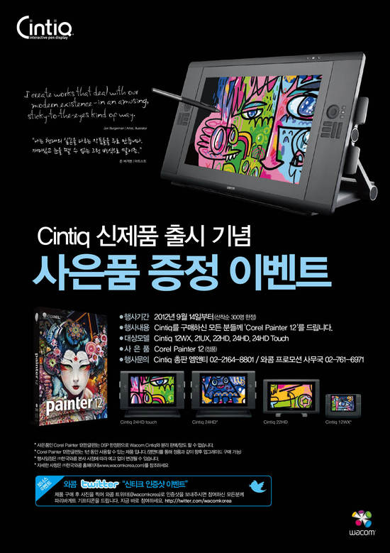 한국와콤(대표 서석건)이 액정 태블릿 신티크(Cintiq) 제품군을 구매하는 선착순 300명에 한해 코렐 페인터 12(Corel Painter 12) 정품 소프트웨어를 증정하는 이벤트를 진행한다.