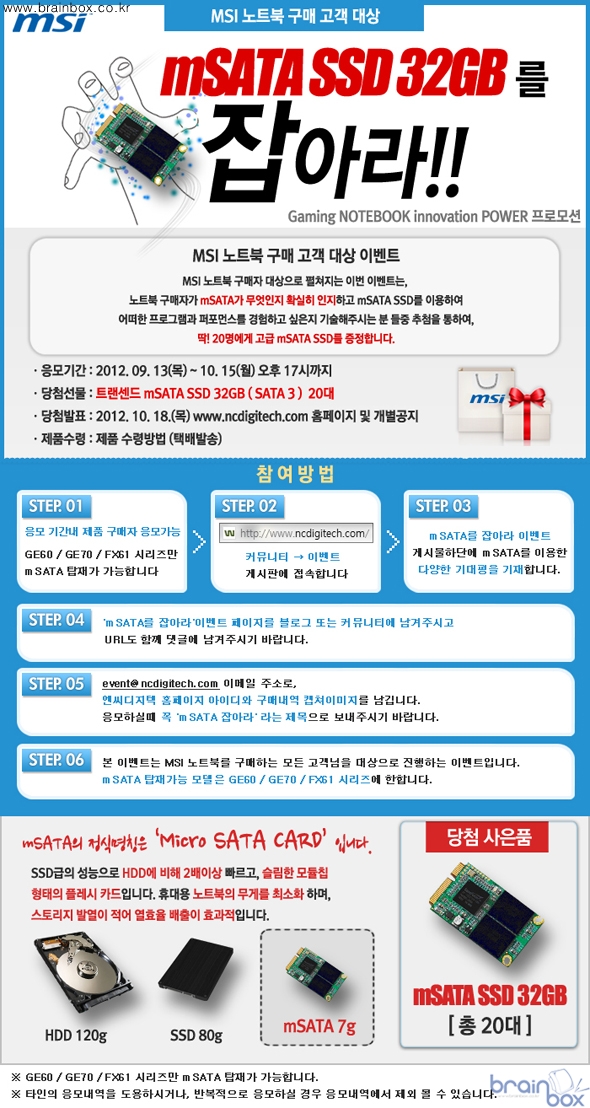 MSI 공식 디스트리뷰터인 ㈜엔씨디지텍(대표 진건도)은 MSI 노트북(전시리즈) 구매 이후, 기대평 응모시 추첨을 통해 총 20명을 선정하여 mSATA SSD 32GB 스토리지를 증정하는 "mSATA SSD 32GB를 잡아라" 이벤트를 진행한다고 19일 밝혔다.