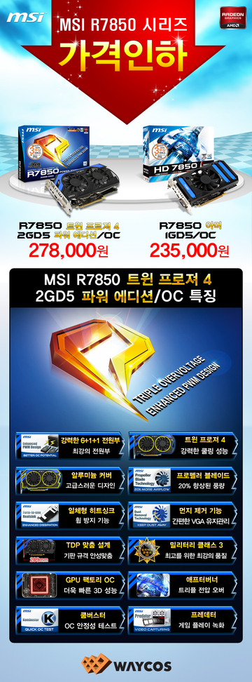 이번 가격인하로 MSI R7850 트윈 프로져 4 2GD5 파워 에디션/OC와 MSI R7850 아머 1GD5/OC는 각각 27만8000원, 23만5000원에 구입할 수 있다.