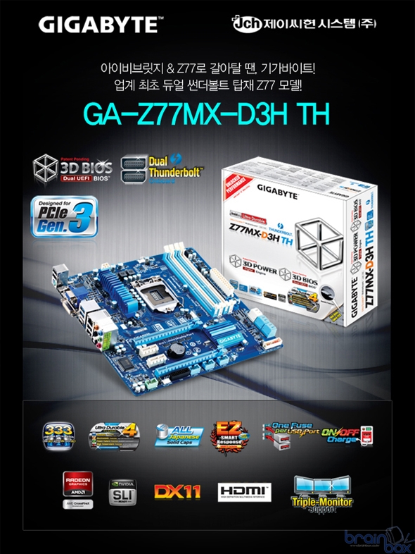 GIGABYTE Technology Co., LTD (이하 기가바이트)의 국내 공식 수입유통사인 제이씨현시스템(주)(대표:차현배)에서 세계 최초로 썬더볼트를 지원하는 m-ATX 플랫폼인 기가바이트 GA-Z77MX-D3H TH 메인보드를 출시 하였다.
