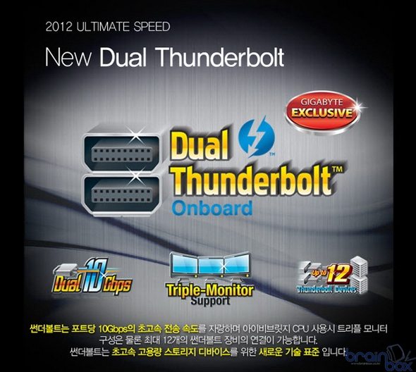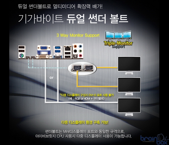 기가바이트에서 세계 최초로 선보인 듀얼 썬더볼트는 Mini-디스플레이 포트와 동일한 규격을 가지고 있어 별도의 외장 그래픽 없이 아이비브릿지 CPU에 내장된 GPU만을 통해 트리플-모니터 사용이 가능하여 멀티 태스킹 환경 구축 및 홈 엔터테인먼트 시스템을 구축하는데 용이하다.