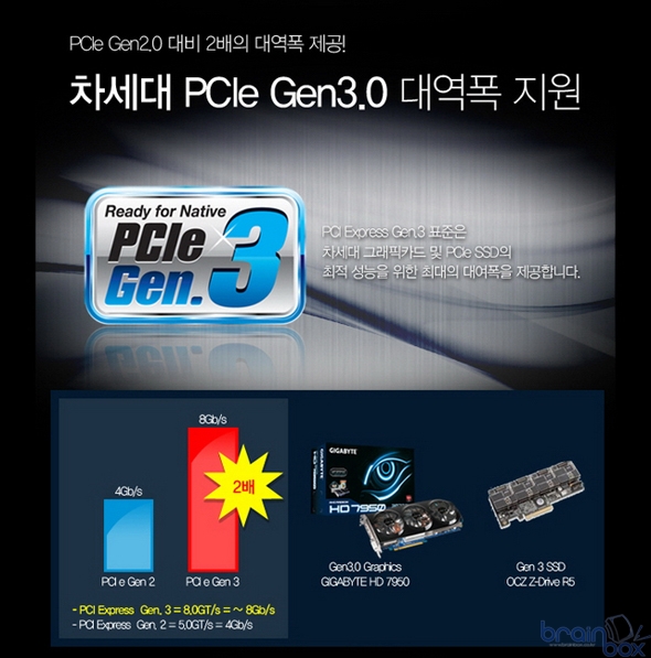 또한, 차세대 PCIe Gen2.0 대비 최대 2배의 대역폭을 제공하는 PCIe Gen3.0 규격으로 최신 고성능 그래픽카드인 nVIDIA GeForce 600 시리즈와 AMD HD7000 시리즈의 뛰어난 게이밍 성능을 즐길 수 있으며, 높은 대역폭을 기반으로 PCI-Express 방식의 하드웨어 장착 시 데이터 병목 현상 없이 사용할 수 있다.