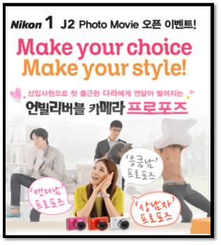 먼저, ‘다라가 선택한 프로포즈남을 찾아라’이벤트는 영상 감상 후 자신의 의견을 덧글로 남기는 이벤트이다. 각기 다른 개성의 주인공들이 Nikon 1 J2를 이용해 산다라박에게 프로포즈하는 영상을 감상한 후 니콘이미징코리아 홈페이지 이벤트 페이지 내에 덧글을 남기면 참여가 완료된다.