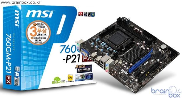 안정적인 전원부 ? 고품질 솔리드 캐패시터 채택 MSI 760GM-P21 (FX) 제품은 CPU와 메인보드에 안정적인 전원을 제공하기 위하여 전원부에 고품질 솔리드 캐패시터를 장착하고 있다. 본 제품에 사용된 고품질 솔리드 캐패시터는 알루미늄 코어를 기반으로 하여, 일반 캐패시터에 비해 10년 이상의 긴 수명을 제공하며 더욱 낮아진 ESR로 낮은 온도를 유지하는 등 높은 효율성을 제공한다. 쉽고 편리한 스마트 오버클럭 ? MSI OC 지니 MSI 760GM-P21 (FX) 메인보드는 MSI OC 지니 기술을 통하여, 간편하게 시스템 성능을 향상시킬 수 있는 특징을 제공한다. 기존 오버클럭 방법은 사용자가 오버클럭시 BIOS 상에서 CPU와 메모리 클럭 및 전압을 수동으로 셋팅해야 하는 번거로움이 있지만, MSI OC 지니는 쉽고 간편하게 OC 지니를 활성화 하는 것 만으로 각각의 시스템에 최적화된 오버클럭을 자동으로 수행하는 편리함을 제공한다.