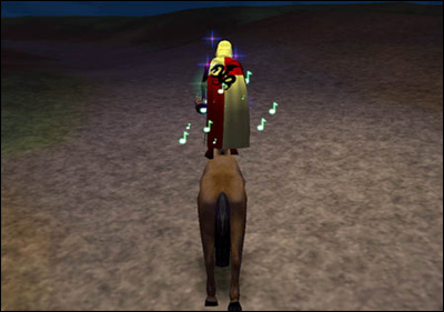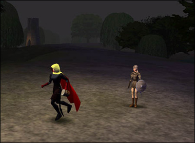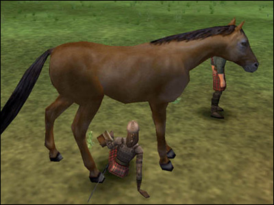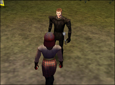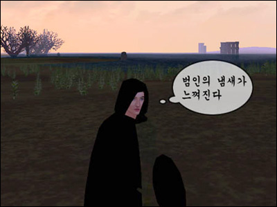 난 “뛰어!!!”라는 말과 함께 말에서 뛰어내려 그를 바짝 쫓기 시작했다. 아니 쫓고 싶었다. -_-; 그녀가 말을 태워놓고 뭘 하고 있는지 도무지 뛰어내리지 않고 있었기 때문이었다. 묘령의 여인: 뛰어? 이미 사기꾼과의 거리는 짐작할 수도 없을 만큼 벌어진 상태. 난 그녀를 데리러 느린 걸음으로 하염없이 뛰기 시작했다. 게다가 반대쪽으로 뛰고 있는 그녀를 스프린트를 켜고 따라가 겨우 붙잡았다는… 슈퍼 스피드 민스트럴 캐릭터를 이용하고 싶은 마음이 굴뚝같았지만 증거포착을 위해 함정 캐릭터를 이용할 수밖에 없었다. 난 묘령의 여인을 픽업하자마자 전속력으로 다시 아발론 마쉬를 향해 달리기 시작했다. 사기꾼을 찾아 아발론 마쉬를 이리저리 헤메기를 한시간. 묘령의 여인과 함께 사기꾼 찾기를 포기하려는 찰나 카위트린 성 앞에 서 있는 그 넘을 발견할 수 있었다!! 러뿡: 앗!!! 범인 포착!!! 묘령의 여인님 잠시 나무 뒤에 숨어계세요! 난 준비해둔 일명 허접복장으로 옷을 갈아입고 난 뒤 그 사람에게 천역덕스럽게 다가갔다. 최대한 얼뜨기처럼 보이기 위해 이리저리 두리번거리기도 하다가 앉았다 일어서기를 반복하며 사기꾼 앞에 도착했다.