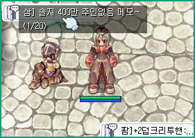 - 포로롱디토(위자드) 현재 보유 제니량 : 4만제니 현재 가진 최고가 아이템 : 산타모자 방어구제련상황 : 전혀 제련이 안되어 있다. 하소연 한마디 : 어느날 내 갑옷을 보았다. 근데... 코튼셔츠였다...