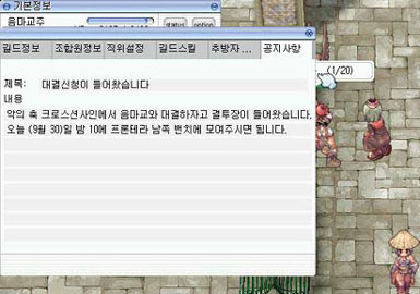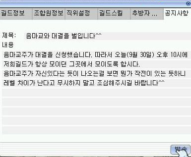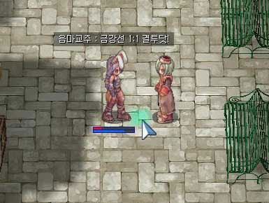 그런데 저녁에 붙자고 했던 음마교주가 돌연 나에게 1:1신청을 했다. 분명 레벨차이가 20이나 나는데 뭘 믿고 1:1을 하겠다는건지 의아했다. “금강선 넌 오늘 끝이야! 1:1 뜨자!” 황당했다. 지난번에도 한번 맞붙은 적이 있긴 했는데 거의 도망만 다녔기 때문이다. 그런데 갑자기 이렇게 덤비는 것은 분명 뭔가 비장의 무기를 가지고 있다는 것. 나는 조금 불안했지만 그래도 음마교주가 뭘 어쩌겠어라고 생각해버리고 결투신청을 받아들였다. 그런데 이렇게 고전할 줄은 몰랐다. 음마교주는 바로... 자, 말로 하면 여러분들이 헷갈려할 것 같아서 특별히 준비했다. 음마교주와 금강선의 1:1 동영상을! 음마교주가 믿고 있던 것은 바로 +8 더블 크리티컬 쥬르였다. 이것은 얼마전 우리 크로스선샤인 길드에서 모든 돈을 투자해서 솔져카드 등을 구해서 완성시킨 우리 길드의 비보였다. 그런데 음마교주는 체리..에게 가서 “우리가 레벨이 낮으니 결투기간까지는 크리쥬르를 넘겨서 우리에게 렙업할 기회를 주는 것이 어때?”라고 했다. 정정당당함을 좋아하는 체리..는 넘어가버린 것이다. 그걸 가지고 바로 결투를 신청해온 음마교주. 그 탁월한 잔머리에 경의를 표하는 바이다.