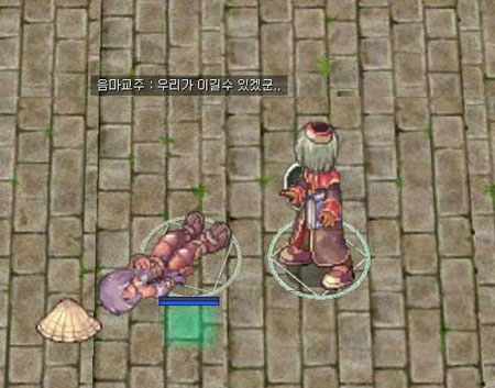 (to 음마교주) 음마교주... 너 설마!!! (from 음마교주) 크하하핫! 이제 눈치챘냐? 멍청이! 우리 거기 빠져나온지 한시간도 넘었다! 크하하하하핫! 우리 지금 그레스트헤임 고성에서 렙업 중인데 니네는 삽질 중이냐? 크크크 그렇다. 완전히 뒷통수를 맞은 것이다. 뒷골이 땡겨서 잠시동안 아무것도 할 수 없었다는 후문이다. 완전히 당해버린 우리 길드는 프론테라에서 다시 음마교를 만났다. 다시 한번 치사한 것 없이 정식으로 붙자고 도전해왔다. 우리는 속는셈치고 다시 한번 음마교와의 대결을 하기위해 PVP존으로 갔다. 그런데 들어가자마자 거리를 휩쓸고 다니는 괴한(?)들에 의해서 우리 팀의 개그신화와 음마교팀의 ⓜow™님이 당해버렸다. 결전을 하기 위해서 들어온 것인데 각 길드원들이 당하자 음마교주는 제의를 했다.