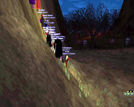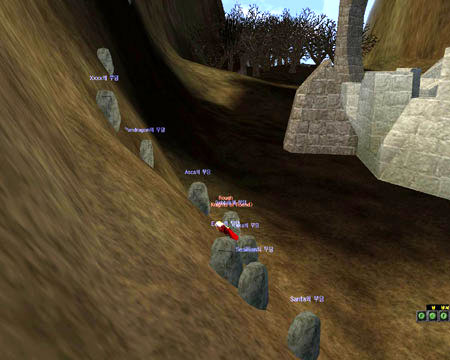 때 지도에 없던 뭔가 이상한 언덕 하나가 눈앞에 그 모습을 드러내고 있었다.허걱~ 네 갈래 길이었다. /loc를 연타하며 현재 위치를 파악하고 아무리 지도를 살펴봐도 당체 어느 방향으로 가야할지 알 수가 없었다. 이렇게 우왕좌왕하고 있던 찰라 사람들은 자이언트와 싸우고 어느 그룹은 다른 방향으로 달리는 등 완전 난장판이 벌어지고 있었다. “뭐해요!!!!” “빨리 안내해요!!!” “저희 그룹 길 잃은거 같아요!!! 어디예요!?!?!” 등등 사방에서 비명이 들려오기 시작했다. 왜 하필 또 자이언트가 떼로 몰려 있는 장소에서 길을 잃을 것은 또 뭐람. 레벨이 낮은 사람들이 자이언트의 발차기에 하나하나 쓰러져가는 모습들이 보이고 주위는 갑자기 아비규환에 빠지기 시작했다. ‘에라~ 모르겠다’ 라는 심정으로 일단 왼쪽 길을 택해 부리나케 달리기 시작했다. 한참을 달리고 대충 안전한 장소를 찾았다고 생각하며 뒤를 돌아보는 순간 우리길드의 2그룹만 나를 따라왔다는 사실을 알 수 있었다. -_-;; 러프: “헉 어디들 계세요?” 사람들: “아악! 어디에여!!!” 연합길드가 이리저리 찢어져 각자 다른 길을 향해 나가고 있었던 것이다. 하는 수 없이 선두 2그룹은 다시 뒤를 돌아 길을 잃고 헤매는 사람들을 찾아보기로 했다. 뚫려 있으면 모든게 길이라는 생각 하나로 무대뽀 정신으로 돌파구를 마련한 러프. "가이드 잘못하면 수십명이 죽는다 -_-;;;;" 이리 뒤지고 저리 뒤지는 작업을 반복한 끝에 결국 흩어진 사람을 대충 모을 수 있었고 정신을 차리고 보니 결국 남은건 우리 길드 4그룹과 정체불명의 무소속 팔라딘 한명. 다른 그룹은 용가리 방향과 전혀 다른 장소인 채석장이나 입구 등 도저히 데리러 나가기가 불가능한 장소에서 이미 자리를 깔고 사냥을 시작하고 있었다. 하는 수 없이 우리 길드는 단독으로 용 구경을 위해 원정길을 나서기로 했다.