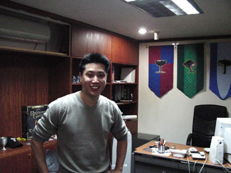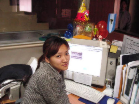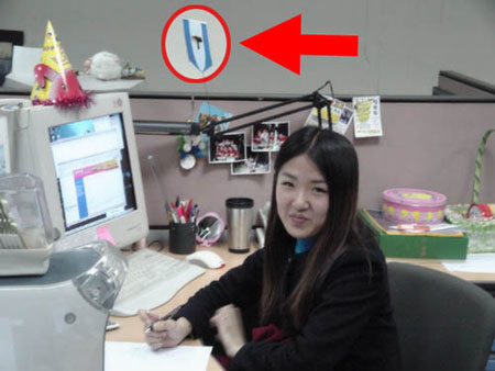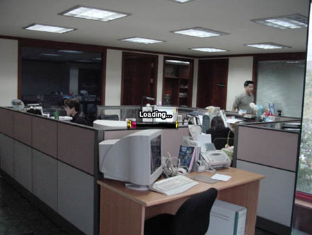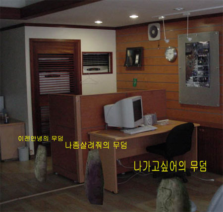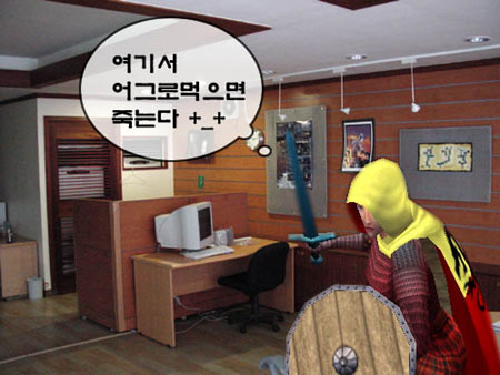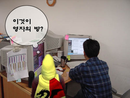 모니터 위에 미드가드의 깃발이 걸려 있는 걸로 보아 분명 그녀는 미드의 첩자인 것이 분명했다. 그런데 주위를 둘러보니 전부 미드가드 깃발이 걸려 있는 것이 아닌가! 염EJ에게 이유를 물어보니 지금 가지고 있는게 이것 밖에 없다는… -_-;; 어쨌든 그녀는 다옥의 홈피와 기타 여러 가지 디자인 업무를 담당하고 있다는 말을 했다. 그런데 뭔가 따가운 시선이 옆자리에서 느껴지는 것이었다. 민첩한 몸놀림으로 오른쪽을 돌아보며 문제의 주인공을 마우스로 찍어보니 그레이콘 자이언트 버프 캐릭 한명이 모니터를 바라보고 있는 모습이 보였다.