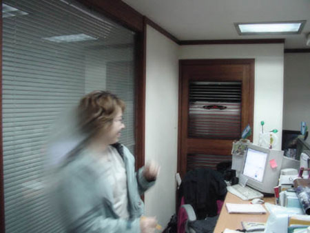 /face 명령어로 그쪽을 돌아보자 어디서 많이 본 듯한 사람 한명이 눈에 들어왔다. 어디서 봤더라? 아 맞아~~ “피볼그다!!!!!!” 라고 외치려고 했지만 왠지 그렇게 얘기하면 주위의 사람들까지 다 링크시켜 날 다구리 시킬 것만 같았다. -_-; 굉장히 미안한 말이지만 그는 하이버니아의 피볼그와 이미지가 상당히 비슷했다. 왠지 모를 이상한 눈빛으로 그를 계속 바라보고 있자 유효승 캐릭은 빙그레 웃으며 날 당황시켰다. 음 역시 디자인팀의 대장을 맡고 있는 여유랄까? 모두 모니터 앞을 뚫어져라 바라보고 있는 사람들과는 다르게 그는 날 향해 멋진 사진 포즈를 취하고 있었다. 이리저리 둘러보며 각종 물건을 만지작거리고 있는 날 염EJ 캐릭은 2층을 구경시켜주기 위해 끌고 올라갔다. 계단을 오르자 갑자기 수많은 렉이 생기며 2층의 전경이 눈앞에 펼쳐졌다.