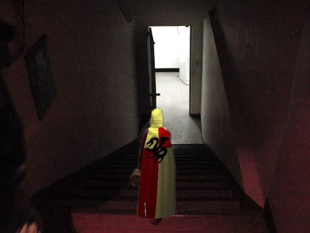 거두절미하고… 여기선 항상 이유를 알 수 없이 마른하늘의 번개가 ‘리요네스의 북쪽하늘에서 이상한 기운이 감돕니다’라는 메시지와 함께 내려치곤 한다. 멍청히 하늘을 바라보던 난 갑자기 궁금병이 도져 숙생이 집에 들어가 볼까 하는 생각이 들기 시작했다. 뒤에서 멍청하게 날 바라보던 팔라딘 한명이 “님 저 돈 점 주세요”라는 메시지를 날리고 있었다. 그러나 난 이미 숙생이집의 중심부를 뚫어지듯이 노려보고 있던터라 더 이상 외부에선 말 한마디 귀에 들어오지 않는 상태였다. 필살의 기합과 함께(민스트럴이 지르는 기합이라봐야 북치는 정도지만 -_-;) 숙생이집으로 달려 들어가기 시작한 러프. 몸에 덕지덕지 달라붙기 시작한 몹을 떼어내고 내부에 들어가자 왠 계단 하나가 아래쪽으로 트여 있는 것이 아닌가? 기존의 필드에선 볼 수 없었던 마치 실사와도 같은 계단에 눈앞에 펼쳐진 것이다.