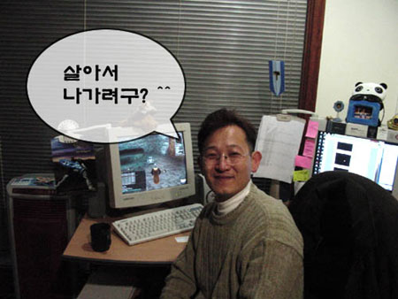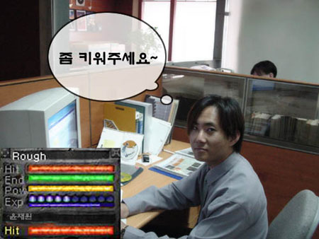 왜 그레이콘인가 했더니만 금방 캐릭터를 만들고 버프렐름에 입성한 신입이란다. 좀 더 렙업이 필요한 인물. 아직 짬밥이 안되는지 내게 어색한 인사말을 한 뒤 다시 일을 하기 시작했다. 그 이유를 알고 보니 다름 아닌 웹디자인 팀장이라는 ‘유효승’ 캐릭이 이쪽을 노려보고 있었기 때문이었다. |