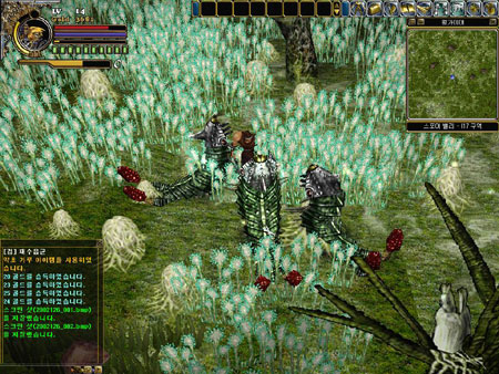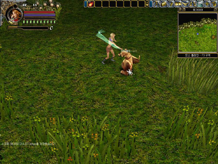 확실히 파이어보다는 강해보였으나 기대했던 것만큼은 아니었다. 그 순간 난 보다 강한 마법에 눈이 갔고 또 어마어마한 레벨과 구입액수에 실망하지 않을 수 없었다. 파이어 볼과 몽둥이 하나로 버티기에 펑가이어 초원은 너무 넓었다. 하도 답답해 혼자 뭐라 주저리 주저리 떠들었다. 메이지 레벨 올리기 넘 어렵다!~ㅜㅡ 레벨도 잘 안오르고 마법책도 넘 비싸다!~ ㅠㅜ 님들!~ 어떻게 하면 좋을까요? 바스티안 유저들... 모두 싸우느라 정신 없었다. 난 어떻게 하면 좋을지 고민했다. 우두커니 마을안에 서 있는게 어색해 초원으로 나왔다. 그리고 정처없이 뛰었다. 혹시 하늘에서 한꺼번에 10만원이 든 돈 뭉치가 떨어지지 않을까 모든 마법을 배울 수 있는 마법책이 떨어지지 않을까 하는 막연한 기대를 품고 뛰고 또 뛰었다. 그래서 도착한 곳은 다름아닌 그로윙 힐 초반 플레이의 대부분의 시간을 보냈던 모스 플레인 바로 옆 동네였다. 별다른 특징이 없어보이던 초원을 유유히 뛰어다니던 난 엄청난 장면을 목격했다. 쌍칼을 든 워리어가 생선회 뜨듯 파란 몹들을 마구잡이로 학살하고 있는게 아닌가? 머리엔 빵모자, 손에는 고무장갑, 발에는 고무장화를 신은 전사가 두 자루의 칼을 휘두를 때마다 몹들은 맥없이 피를 흘리며 쓰러졌다. 그것도 모두 한 방으로...--; 몹 한 마리 없앨려면 맞아가며 몽둥이로 수십번 때려야 쓰러뜨릴 수 있었던 내 자신이 너무 우습게 느껴졌다.