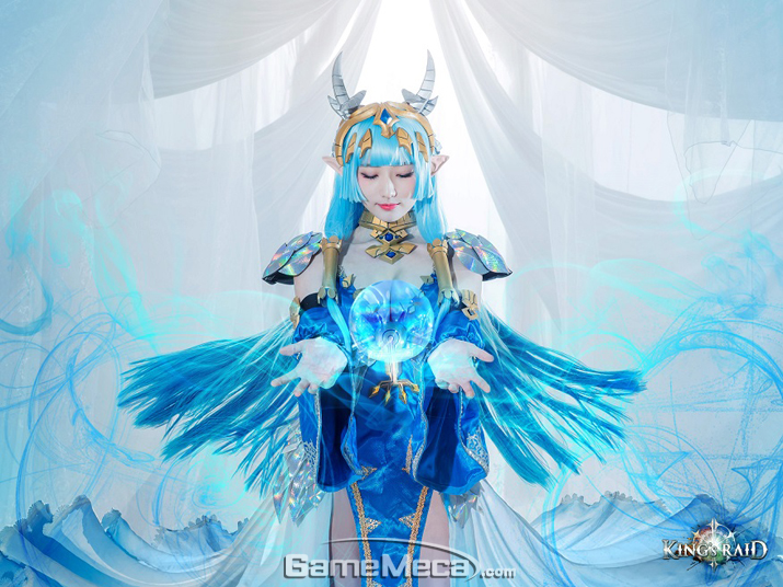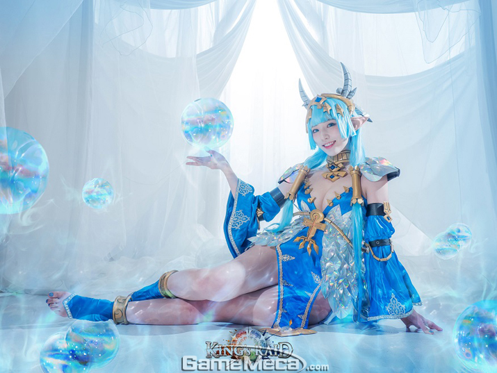베스파는 30일, 자사 모바일 RPG '킹스레이드' 캐릭터 '라이아스' 코스프레 화보를 공개했다. '라이아스'는 사막의 오아시스를 지키는 무녀로, 인간의 모습을 하고 있지만 기나긴 세월을 살아온 블루 드래곤이다. 플레이에서는 아군에게 스킬 사용에 필요한 마나를 채워주는 능력을 발휘한다