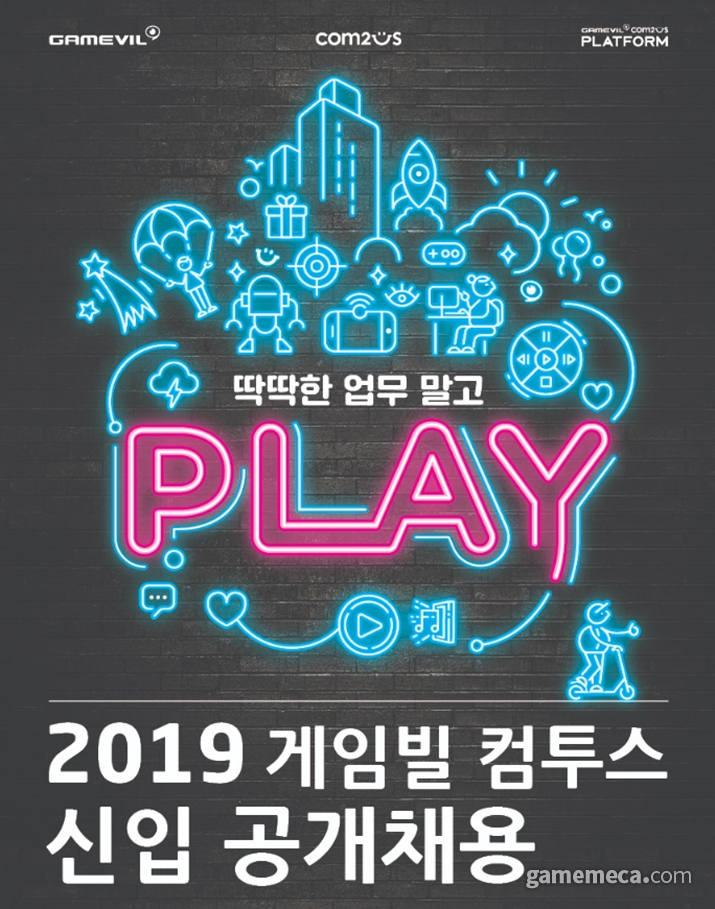 바일 게임 기업 게임빌-컴투스가 신입사원을 공개 채용한다. 게임빌-컴투스의 이번 공개 채용은 게임 기획, 프로그래밍, 아트 등의 개발 직군과 게임사업 및 마케팅, 경영관리, 플랫폼개발 등 다양한 분야의 인재를 대상으로 진행된다. ‘딱딱한 업무 말고 PLAY’라는 슬로건을 내세운 이번 공채는 오는 10월 10일까지 공식 채용 홍페이지를 통해 입사 지원이 가능하며, 이후 서류 전형을 시작으로 필기 테스트와 면접 등의 채용 과정이 진행될 예정이다