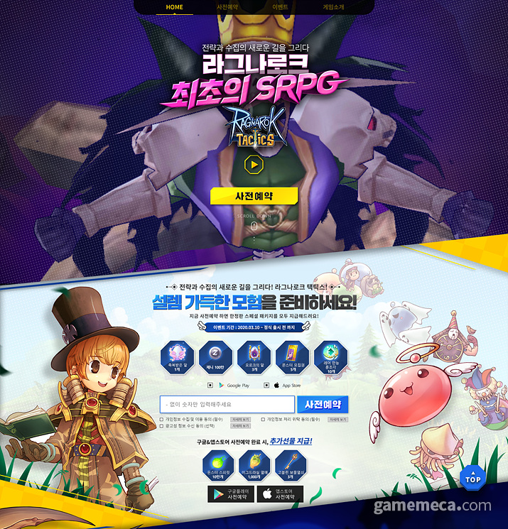 ‘라그나로크 택틱스’ 사전예약은 3월 10일부터 출시 전까지 사전예약 페이지와 구글 플레이 스토어, 애플 앱스토어에서 진행된다. 사전예약에 참여하는 모든 유저에게 ‘몬스터 모집권’, ‘100만 제니’ 등 게임 출시 후 유용하게 사용할 수 있는 ‘게임 재화’를 제공한다. 사전예약 페이지에서 예약 후 마켓에서도 사전예약을 신청하면 추가 보상을 지급한다.