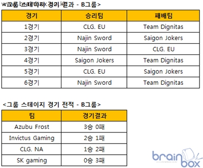 오전 그룹 스테이지 A그룹의 한국 대표팀인 아주부프로스트가 조 1위로 8강에 진출한데 이어, B그룹에서도 나진소드도 전승으로 조 1위로 8강 진출을 확정했다. 그 외 B조에서는 CLG. EU가 2승 1패로 8강에 진출했습니다. 한국 2개팀이 조 1위를 휩쓸며 롤드컵에 큰 바람을 일으키고 있다. 이로써 8강에 오른 총 8개의 팀도 확정되었는데, 최종적으로 한국 대표팀 2팀이 모두 생존하는 쾌거를 이루었다. 나머지 8강 경기는 내일 새벽에 진행이 될 예정이다.