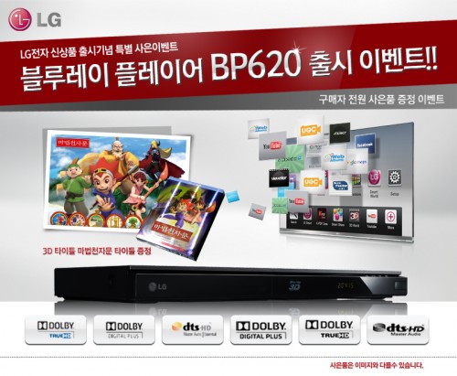 LG BP620 유통사 가림토는 출시 기념으로 이를 구매하는 모든 사람에게 다양한 입체효과를 생생하게 보여주는 3D 블루레이 타이틀 ‘마법천자문’을 증정한다. 이벤트는 10월 한달간 선착순으로 진행되며, 준비된 사은품이 전부 소진되면 행사는 자동 종료된다.