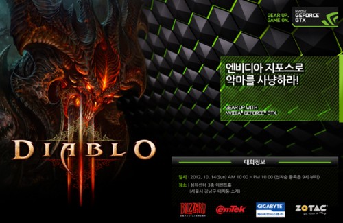 "엔비디아 지포스로 악마를 사냥하라!"라는 주제로 열리는 이번 디아블로 3 게임 대회는 국내에서는 시도된 적이 없는 4인 1팀이 제한시간 4시간 동안 플레이 해 진행 거리와 레벨의 합을 점수로 환산해 순위를 정하는 하드코어 모드라는 새로운 방식으로 진행되며 우승팀에 상금 500만원을 비롯해 2등 300만원, 3등 180만원과 상품권 등 총 1,000만원 상당의 상금 규모로 열린다.