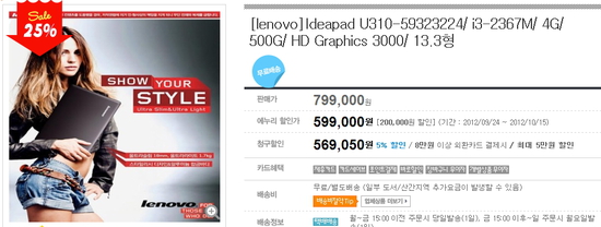 이동/휴대를 목적으로 노트북을 구매하려는 소비자들이 굉장히 관심이 있을만한 소식이 있다. 이마트에서 진행하는 특가전이 바로 그것인데, 레노버 1세대 울트라북 U310-59323224를 오픈마켓 가격(658,210)보다 5만 9천원 저렴한 569,050원에 살 수 있다.