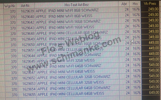 애플의 아이패드 미니(ipad mini)가 출시되기도 전에 가격이 먼저 노출됐다. 유럽의 대형 전자유통업체의 재고관리 시스템 화면이  13일(현지시간) 독일에서 공개된 것. 이 화면에는 애플의 아이패드 미니의 가격 정보가 모두 들어있다.
