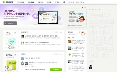 오아시스는 직장인들의 업무 궁금증을 해결해주고, 분야별 전문가 그룹인 지식 마스터를 중심으로 지식나눔과 멘토링을 해주는 직장인을 위한 지식 포털 서비스다.