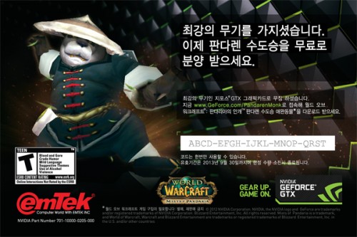 이엠텍아이엔씨(대표:이덕수, www.emtekinc.com)는 엔비디아와 함께 지포스 GTX 그래픽카드 구매 고객에게 블리자드 엔터테인먼트의 인기 MMORPG(다중 접속 온라인 역할 수행 게임)인 월드 오브 워크래프트: 판다리아의 안개 판다렌 수도승 애완동물을 무료로 받을 수 있는 사은 쿠폰 행사를 연다.