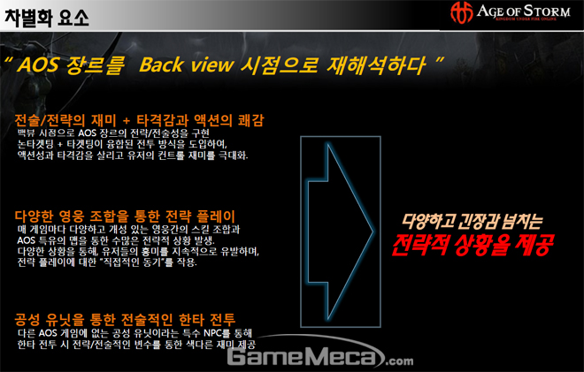 드래곤플라이의 김지은 팀장이 현장에서 소개한 '에이지오브스톰'의 특징은 크게 3가지 키워드로 압축된다. 시점과 진입 장벽 그리고 한타 싸움이 그것인데, 김 팀장은 기존의 AOS 장르 게임들이 위에서 아래를 내려다보는 쿼터뷰 방식과 달리 3인칭 백뷰 시점으로 구현하여 몰입감과 사실적인 전투의 재미를 극대화했다고 설명했다.