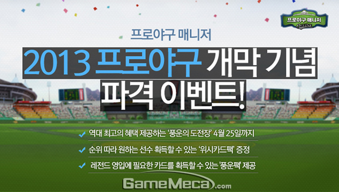 엔트리브소프트는 프로야구단 운영 시뮬레이션 게임 '프로야구매니저'에서 2013 프로야구 개막을 맞아 역대 최고의 혜택을 제공하는 '풍운의 도전장' 이벤트를 실시한다고 금일(28일) 밝혔다.