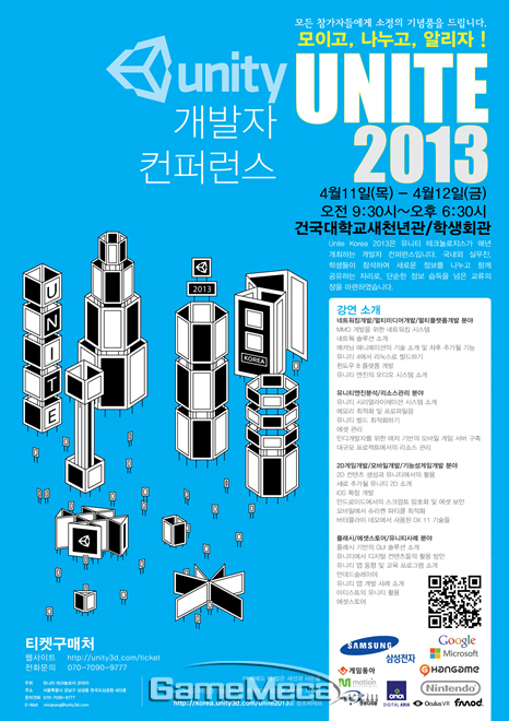 보다 자세한 사항은 ‘유나이트 코리아 2013’ 공식페이지(http://korea.unity3d.com/unite2013)를 통해 확인할 수 있다.