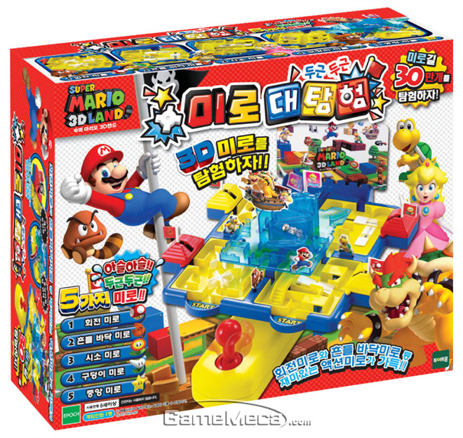 ‘슈퍼마리오 미로 대탐험’은 공을 움직이며 미로 속을 탐험할 수 있는 3D 미로게임으로 원하는 길로 공들을 옮겨서 목표 달성에 도전하는 보드게임. 회전미로와 흔들 바닥미로, 구덩이미로 등 재미있는 액션미로가 가득한 것이 가장 큰 특징이다. 여러 가지 바닥판을 응용하면 난이도가 변화되며 만들어지는 미로길이만 무려 30만개로 강한 두뇌회전력은 물론 집중력, 친화력, 균형감각을 길러준다.