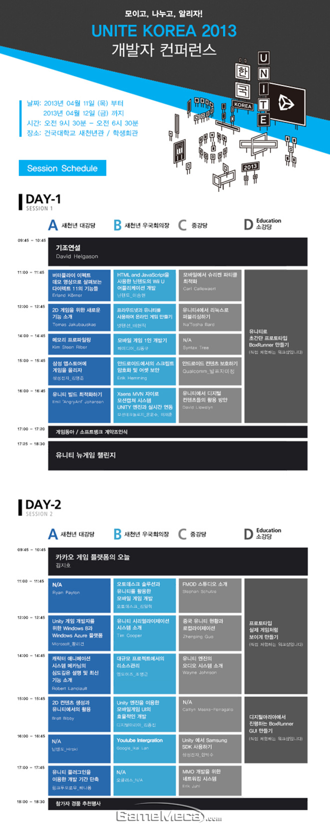 유니티 테크놀로지스 코리아는 오는 11일과 12일 양일간 건국대학교 새천년관에서 개최되는 유니티 개발자 컨퍼런스 ‘유나이트 코리아 2013(Unite Korea 2013)’의 상세 세션 스케줄을 공개했다.