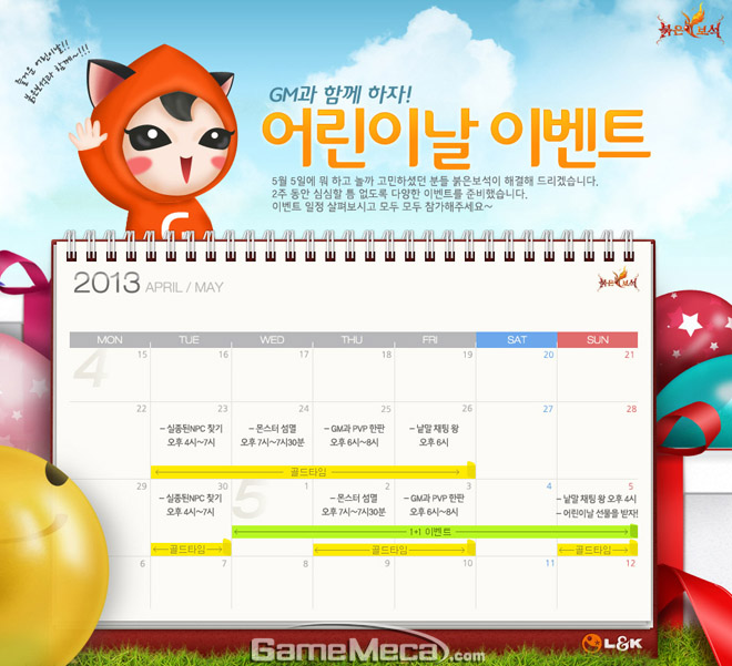 이외에도 ‘낱말 채팅 왕이 되자!’ ‘1:1 한판승 GM을 이겨라!’ 등 다채로운 이벤트가 준비되어 있으며, 아울러 GM과 함께하는 모든 이벤트 종료 시 마다 경험치와 드롭율이 2배가 되는 골드타임이 2시간 동안 진행된다.