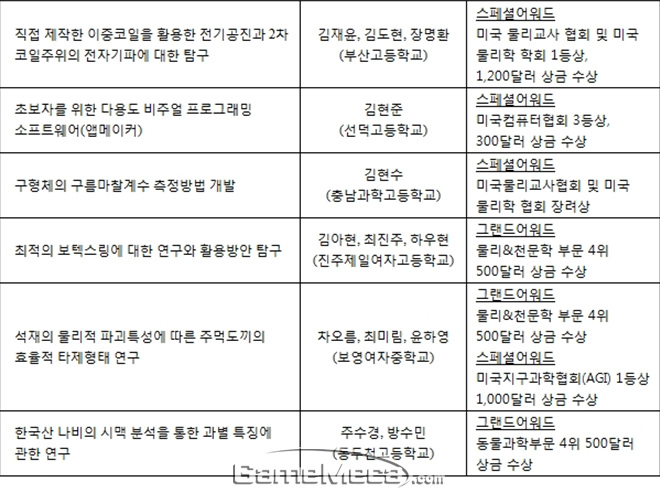 ▲ ISEF 한국 대표 학생들과 수상 내역