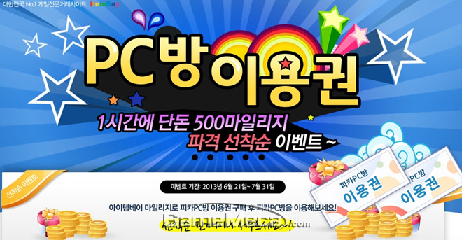 아이템베이가 피카 PC방 이용권을 반값에 판매하는 'PC방 반값 할인 이벤트' 를 진행한다. 이번 이벤트는 1시간 요금이 평균 1,000원 ~ 2,000원인 피카 PC방 이용권을 약 50% 할인된 가격으로 제공하는 것으로, 1시간 이용권 500원, 3시간 1,500원, 5시간 2,500원에 판매된다