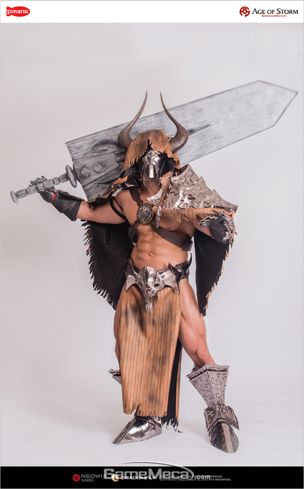 네오위즈게임즈는 오는 8월 8일 정식서비스를 시작하는 AOS게임 '킹덤언더파이어 온라인: 에이지오브스톰' 의 대표 캐릭터 '레그나이어' 를 대상으로 한 강렬한 근육의 코스프레 이미지를 공개했다