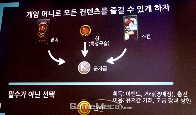 진승현 팀장: 일단 게임 내 모든 콘텐츠는 게임에서 얻는 게임머니로 구매할 수 있다. 예를 들면 공개서비스에서 스킨이나 장비(특성)를 착용해 캐릭터를 강화할 수 있는데, 이러한 장비 콘텐츠는 게임머니로 구매해야 한다. 코인(캐시)은 유저들 간의 장비 거래 용도로 사용되며, 그 외에 확률이 높은 대장간 장비를 구매하는 등의 용도로 사용된다. 코인을 통해 장비 등을 구매할 수 있게 한다면 과금 유저와 비과금 유저의 차이가 발생할 것으로 예상되기 때문에, 이러한 점은 지양하려 하고 있다.