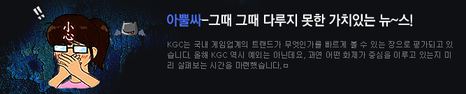 국내외 게임업체 실무자들이 강연자로 나서는 KGC는 현재 시장 흐름을 한눈에 읽는 장으로 평가된다. 스마트폰 게임이 화두로 떠오른 2012년의 경우, KGC 현장에서도 관련 강연 다수가 진행된 바 있다. 그렇다면 올해 KGC 현장에서 이야기될 한국 게임업계 최신 트렌드는 과연 무엇일까?